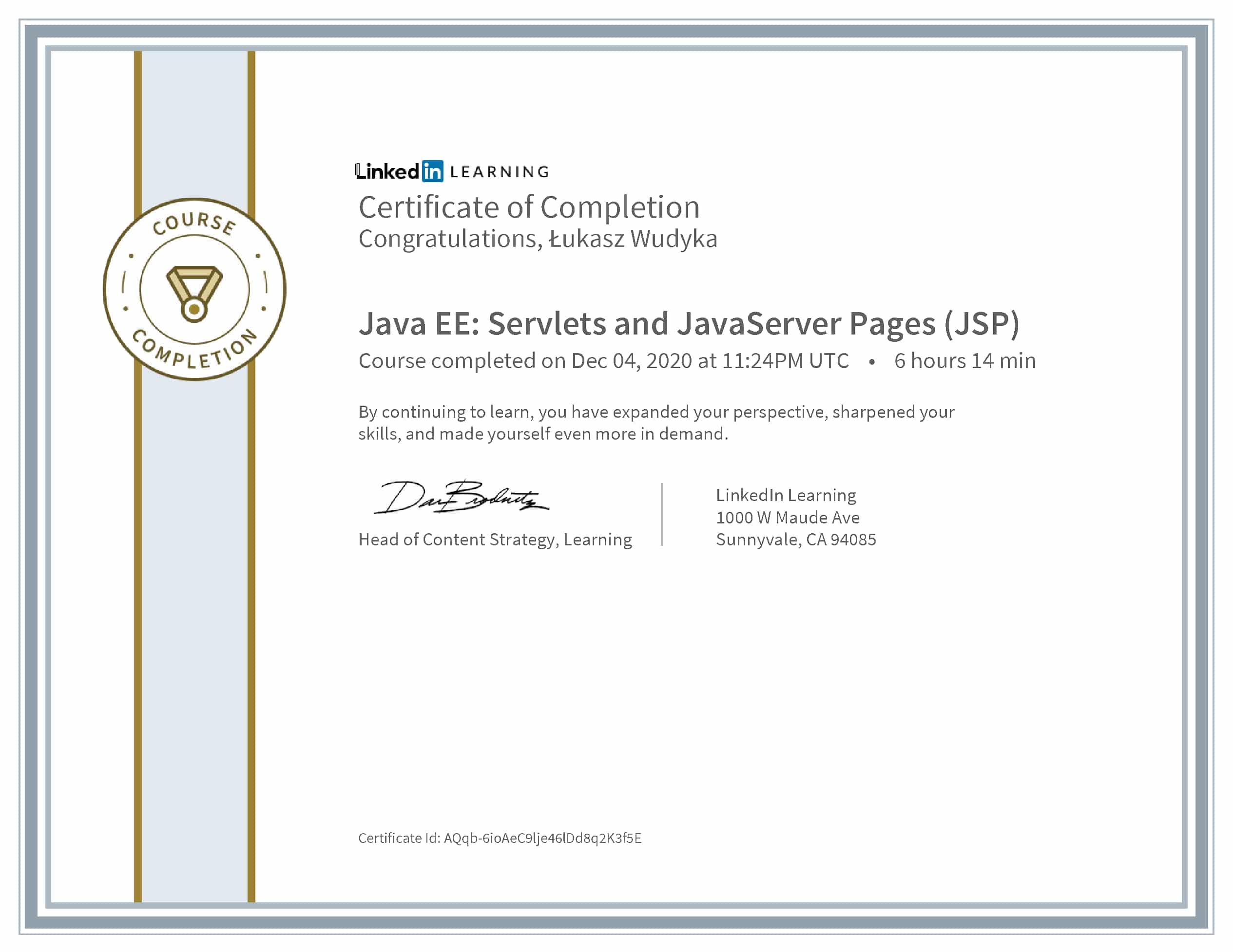 Łukasz Wudyka certyfikat LinkedIn Java EE: Servlets and JavaServer Pages (JSP)