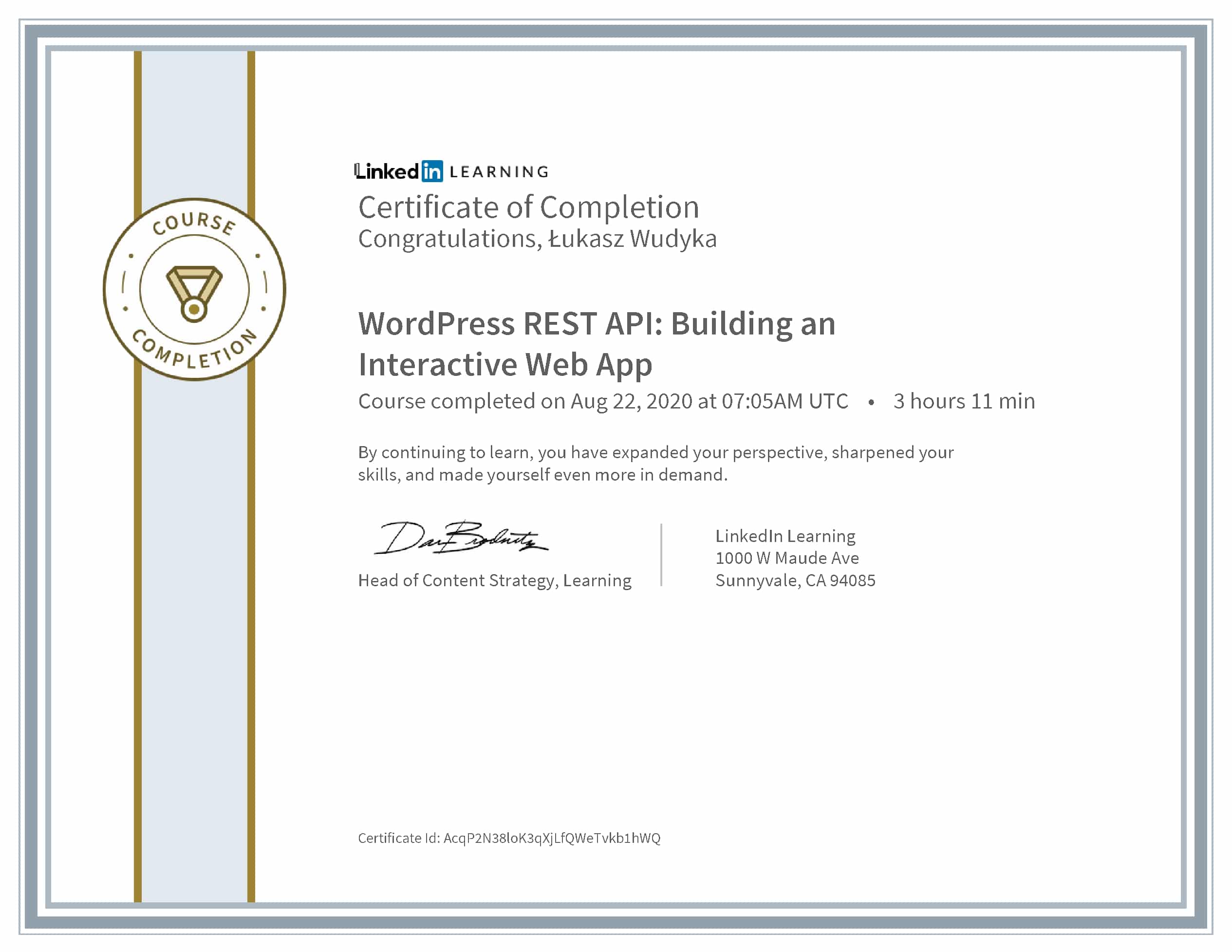 Łukasz Wudyka certyfikat LinkedIn WordPress REST API: Building an Interactive Web App